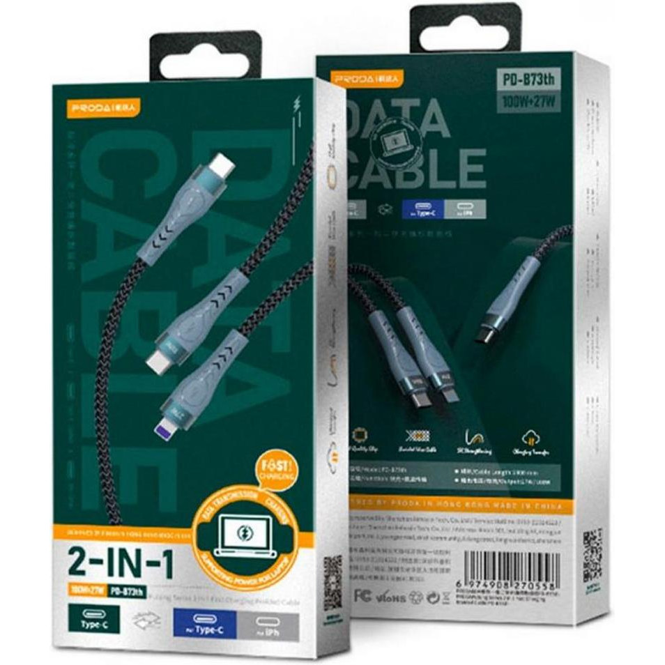 Кабель Proda PD-B73th, USB Type C to USB Type-C/Lightning, 5А, 1.3м, Black (PD-B73th-BK)