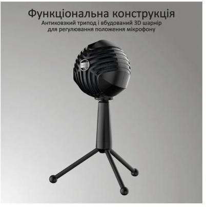 Антиковзний трипод та вбудований 3D шарнір для регулювання положення мікрофона. LED підсвічування.