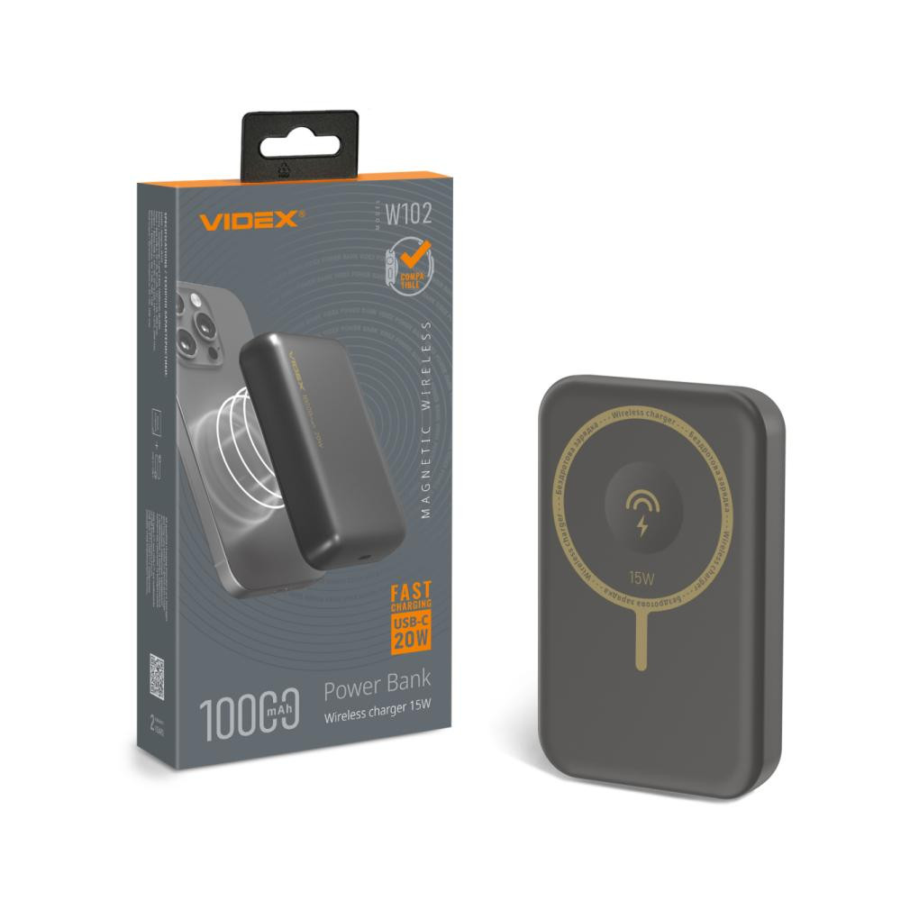 Зовнішній акумулятор Powerbank VIDEX VPB-W102-G, 10000mAh, бездротова зарядка, PD20W, Grey