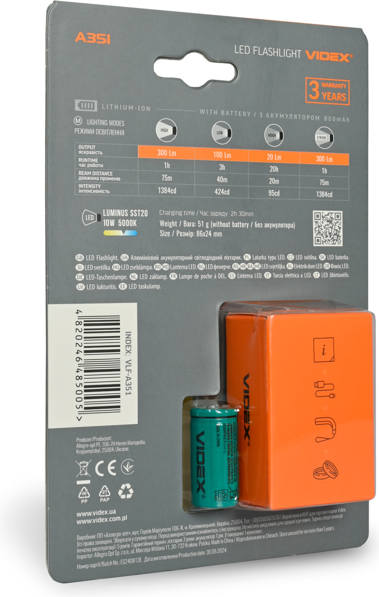 Ліхтарик портативний, світлодіодний VIDEX VLF-A351, 300Lm, 5000K