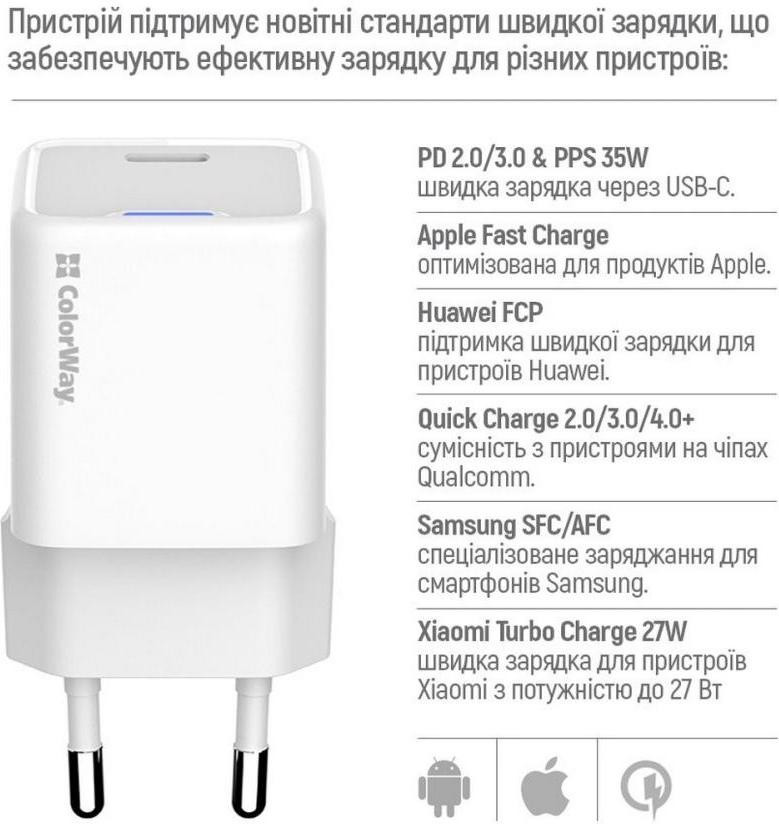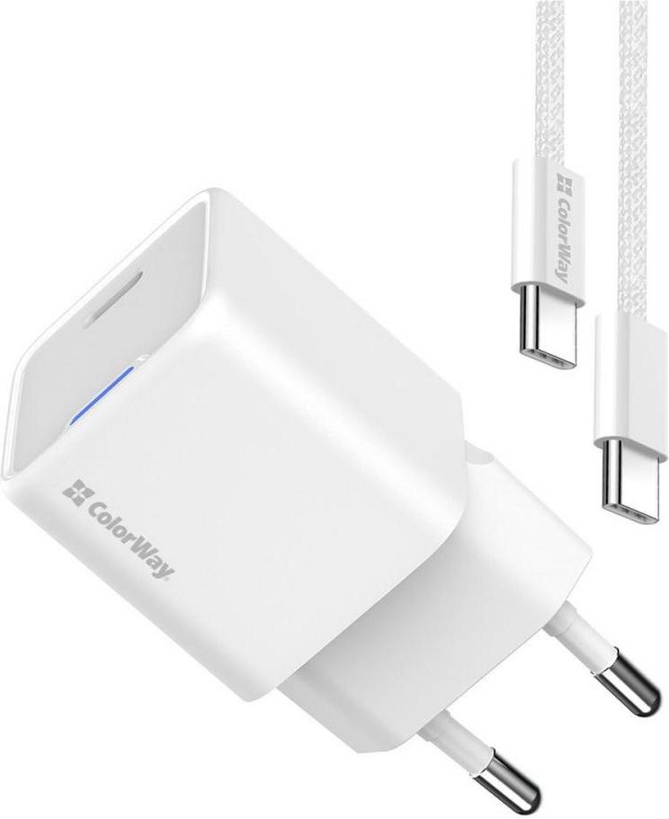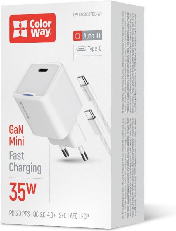 Мережевий зарядний пристрій ColorWay GaN Mini, USB Type-C, 35W PD, PPS, кабель USB Type-C to USB Type-C, White (CW-CHS056PDC-WT)