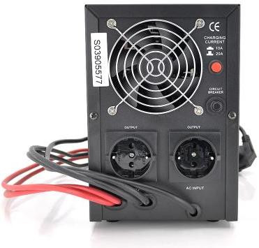 Технічні характеристики: Номінальна потужність: 500VA / 300 Ватів Коефіцієнт потужності: 0,6 Тип вихідного сигналу: правильна синусоїда Вхідна напруга: 220V: 145 ~ 275V AC Вихідна напруга: 220V: 220V AC ± 10% Вихідна напруга при роботі від батареї: 220V AC ± 5% Час перемикання: 2 ≤ 6ms Перемикач струму заряду на 5 та 10 А (максимальний) Стабілізація (AVR): 3 ступені (мікропроцесорне управління, крок 22,5V) Нижні пороги перемикань: 140V ± 5V AC Верхні пороги перемикань: 275V ± 7V AC Частота: 50Hz / 60Hz Захист від короткого замикання: є Аварійне відключення (захист від перевантаження): є Захист від повного розряду батареї: є Холодний старт: є Наскрізний нуль: є USB інтерфейс: - RS-232 інтерфейс: - Захист ліній зв`язку: - Звукова індикація: є Тип індикації: Дисплей Зовнішня батарея: 12В, Рекомендована ємність батареї: 20 - 100 А / г !!! Тип запобіжника: термічний Кількість розеток Schuko: 2 Тип корпусу: метал, колір чорний Тип кріплення: підлоговий Робоча температура: 0 – 45°С Особливості: ДБЖ не працює як стабілізатор без підключення акумуляторної батареї Перемикач току заряду 5 / 10А Кнопка увімкнення або виключення інвертора від навантаження Індикація підвищення або зниження вхідної напруги Індикація перевантаження ДБЖ Індикація відключення ДБЖ через перегрів