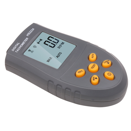 Колір: темно-сірий жовтий Модель: HS2234 матеріал: пластик 1.8' РК 5-розрядний дисплей Діапазон вимірювання: від 2.5 до 99999 об / хв Роздільна здатність: 0.1RPM (2.5 ~ 999.9RPM); 1RPM (понад 1000RPM) Похибка: + / - (0.05% + 1 цифра) Час виміру: 0.5 секунди (більше 120RPM) Еталон часу: кристал кварцу Ефективний вимір відстані: 50мм ~ 500мм Потужність: 25 мА при низькій потужності лазера / 40 мА при високій потужності лазерного Живлення від 2 х батарей ААА